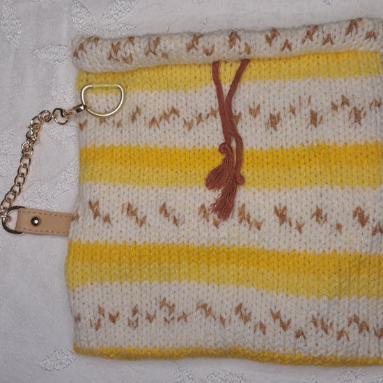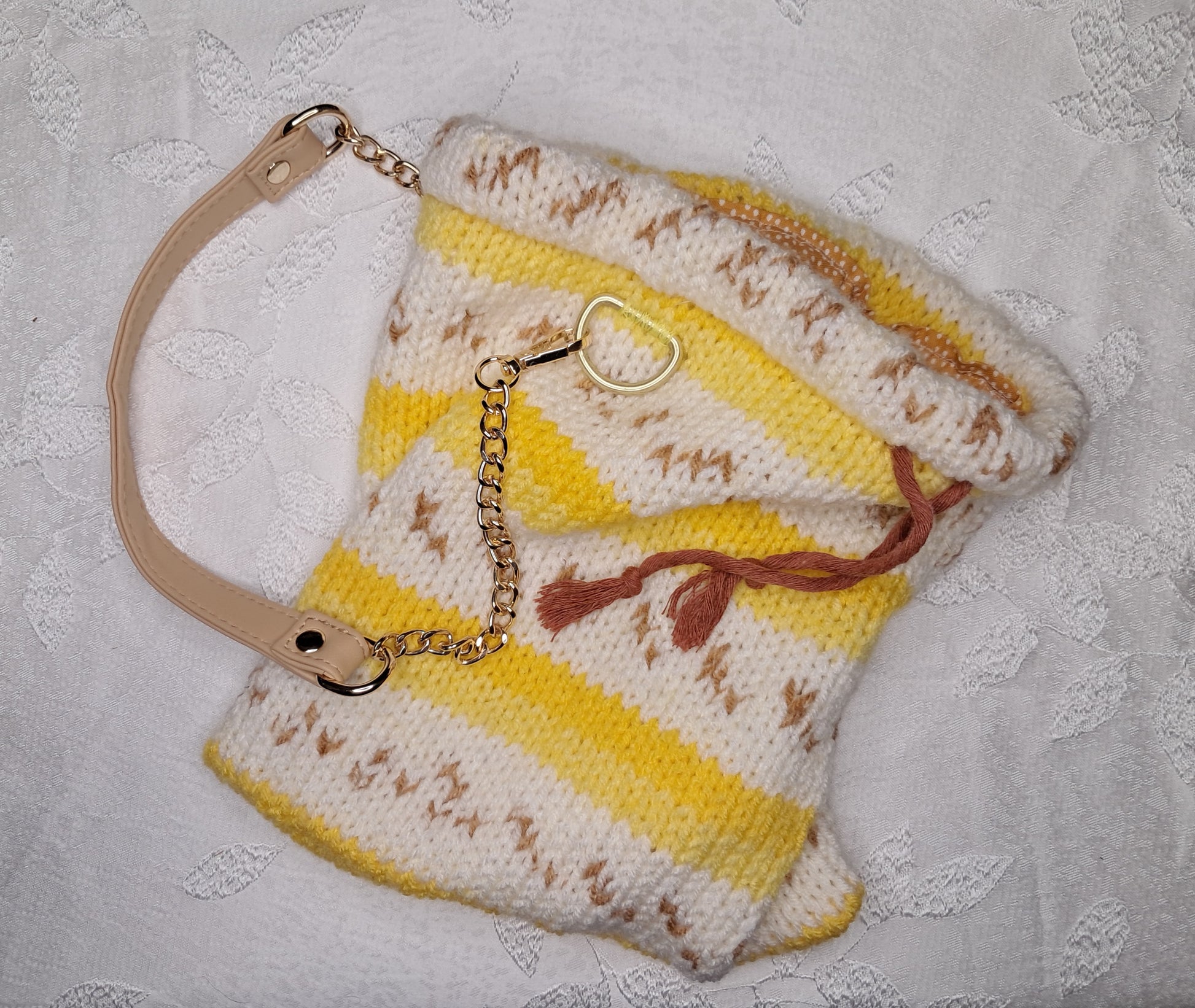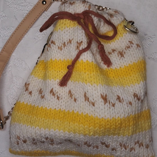 Made with Acrylic yarn with the inside lining is a cotton fabric in an orange and white polka dot pattern. The Drawstring is a Cotton cord. While the strap is faux leather attached with a metal chain to an oval D-ring that is hand sewn on.