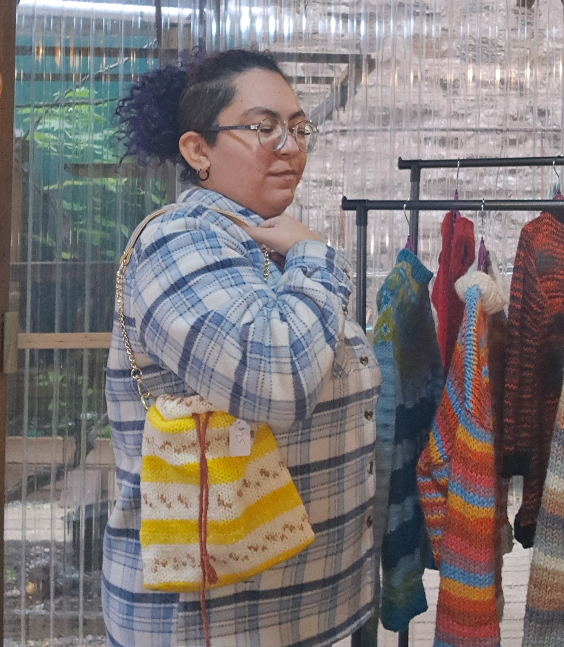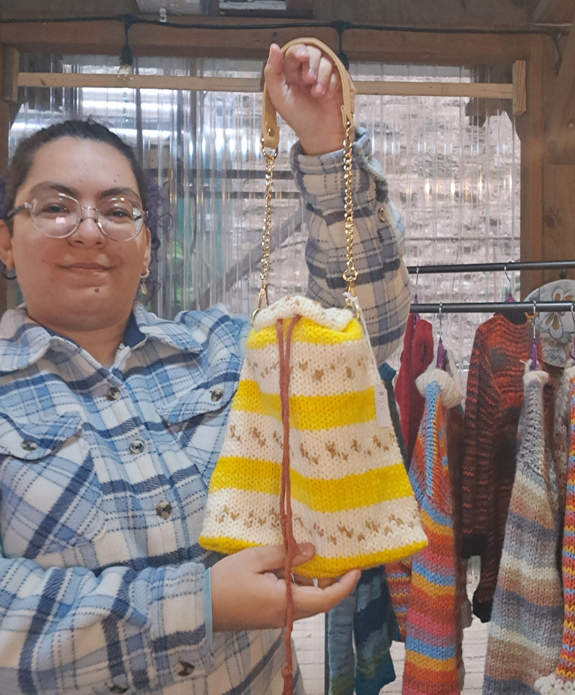 The bag is big enough to fit most common items, phone, wallet, glasses and keys with some room to spare. The yarn creates a Banana pattern hence the name.