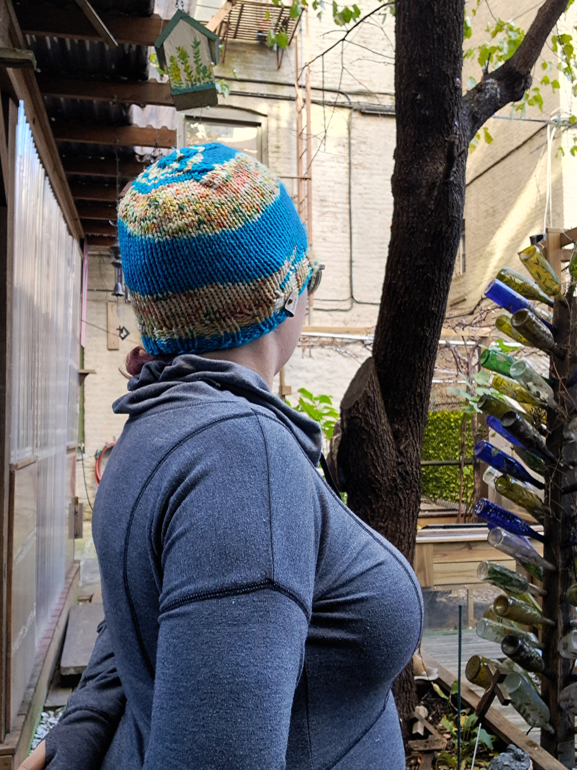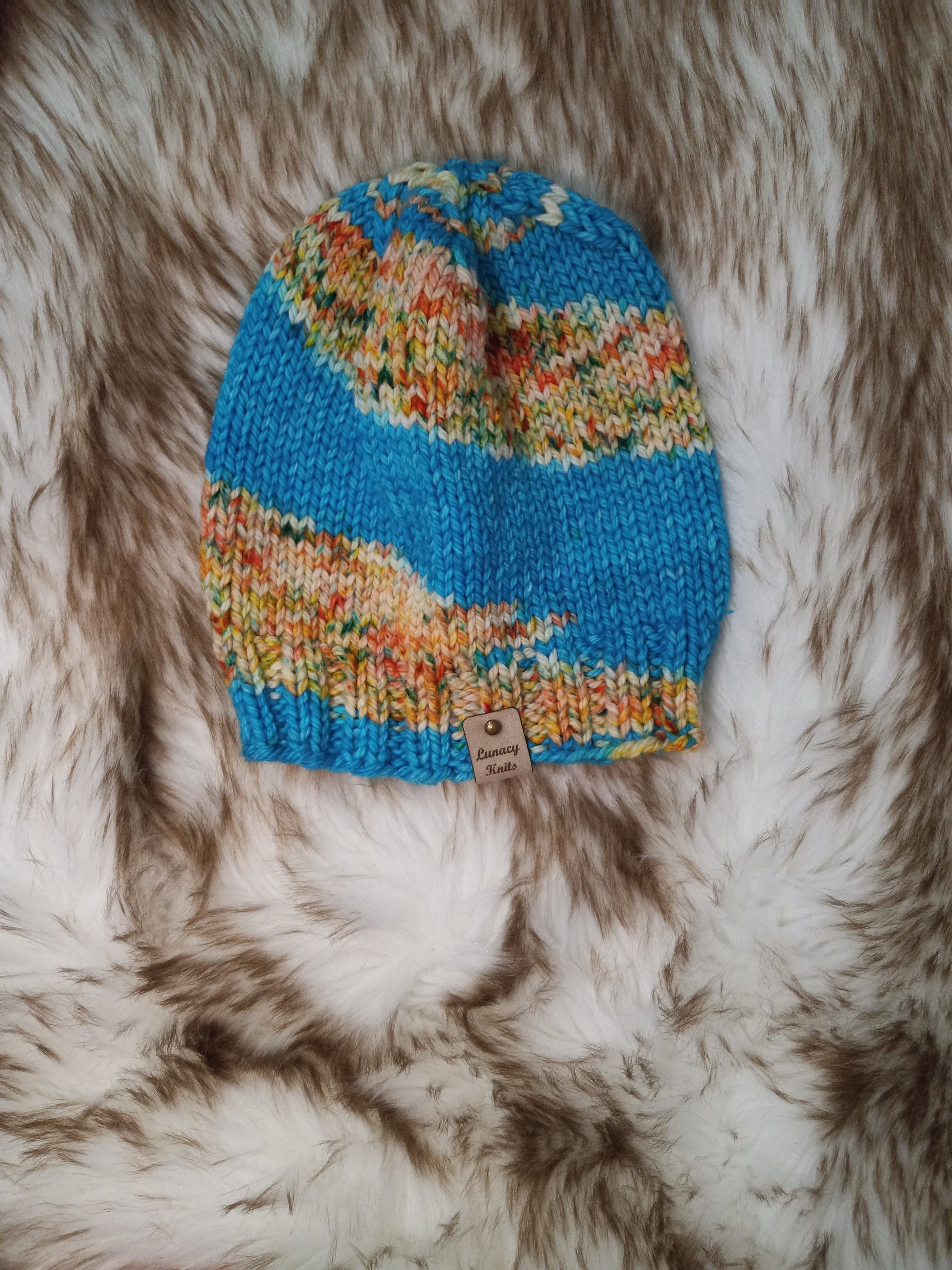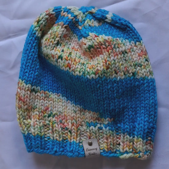 Beachy Swirl is showed in the crashing blue waves of the beach meeting the warm yellow sands. This hat is made with a hand dyed yarn the swirls so beautifully in two colors, the blue and the yellow.