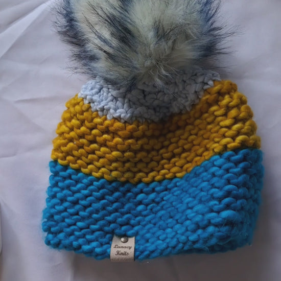 Fiber- Hand dyed Merino wool [Blue and Gold] and Cotton blend with wool [Light blue] with a faux fur Pom-pom.