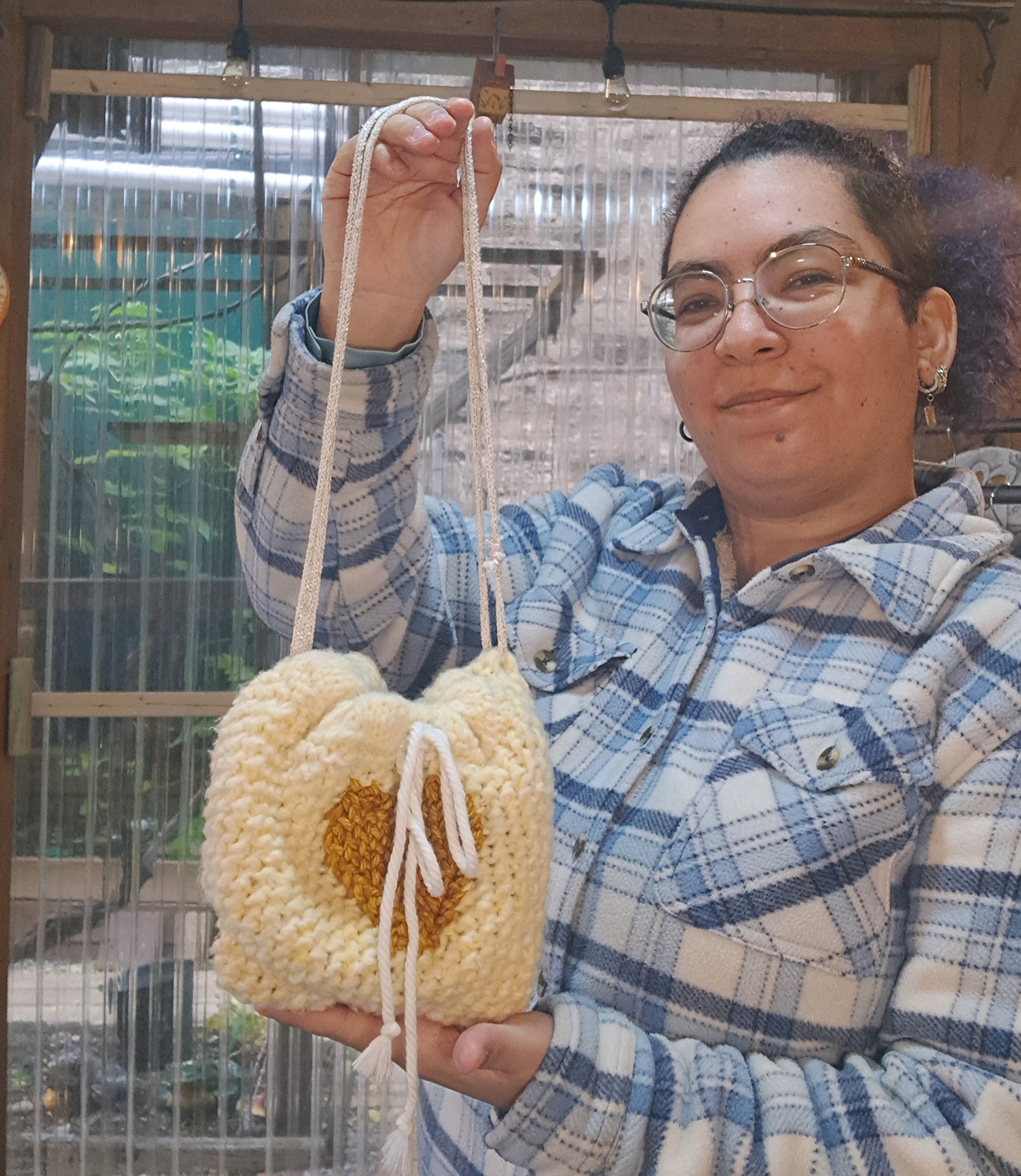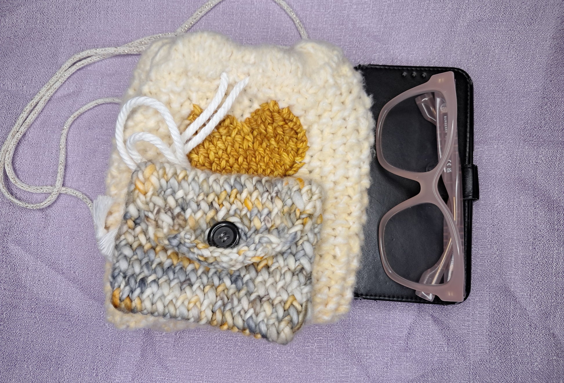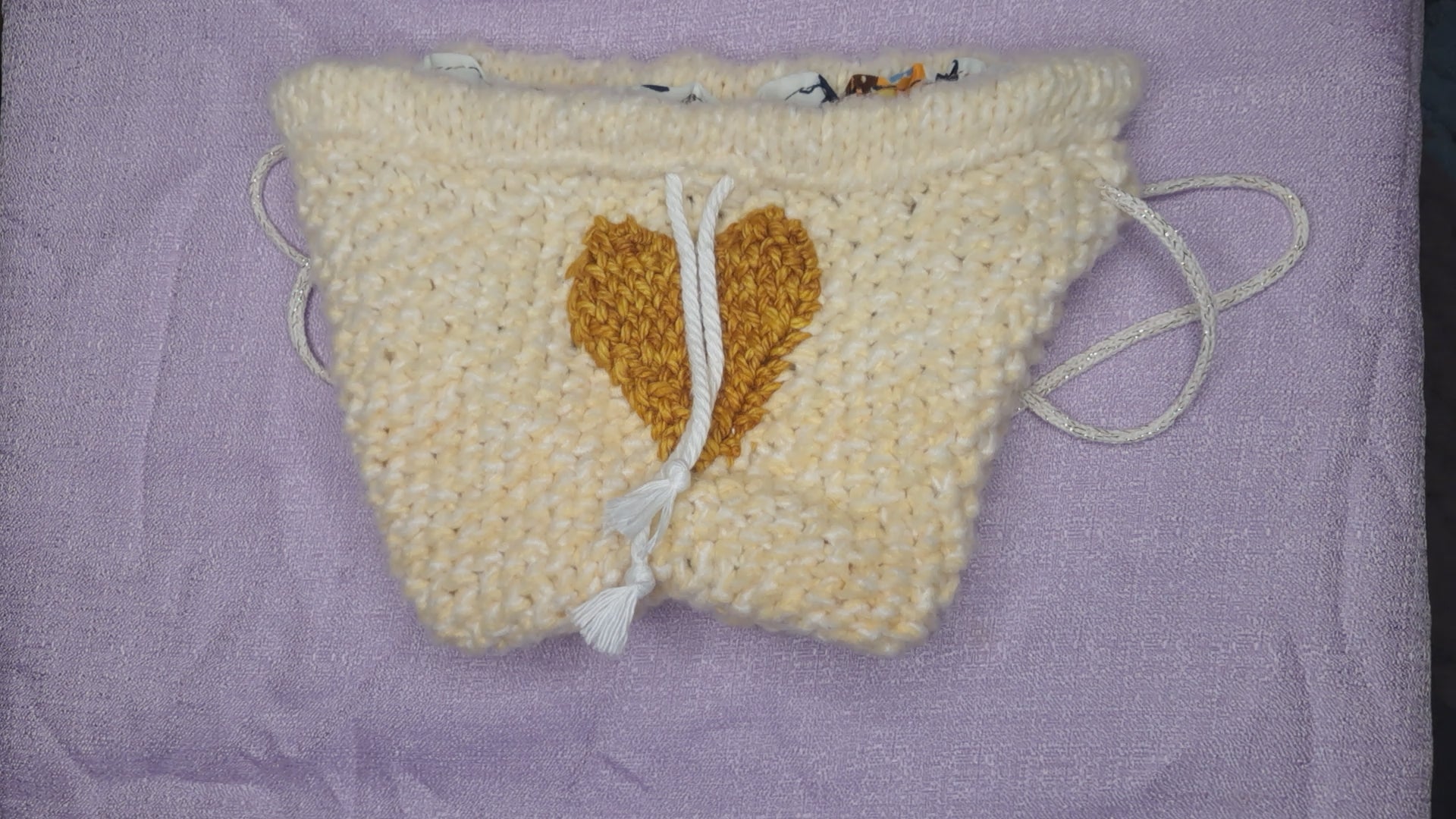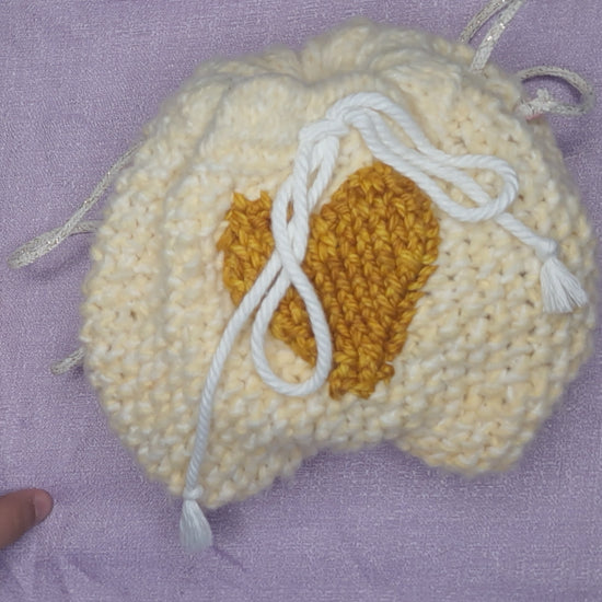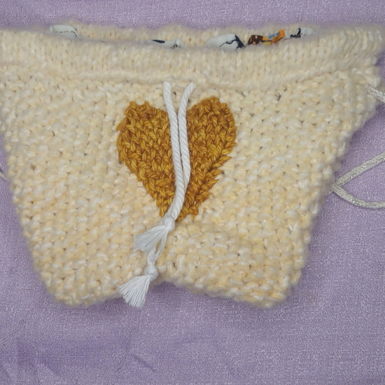 Made with Polyester yarn that is soft as can be and a satin patterned lining. The Golden heart is made with Hand dyed Merino wool. The Drawstring is a Cotton cord and the straps are a Cotton cord with Metallic Polyester.