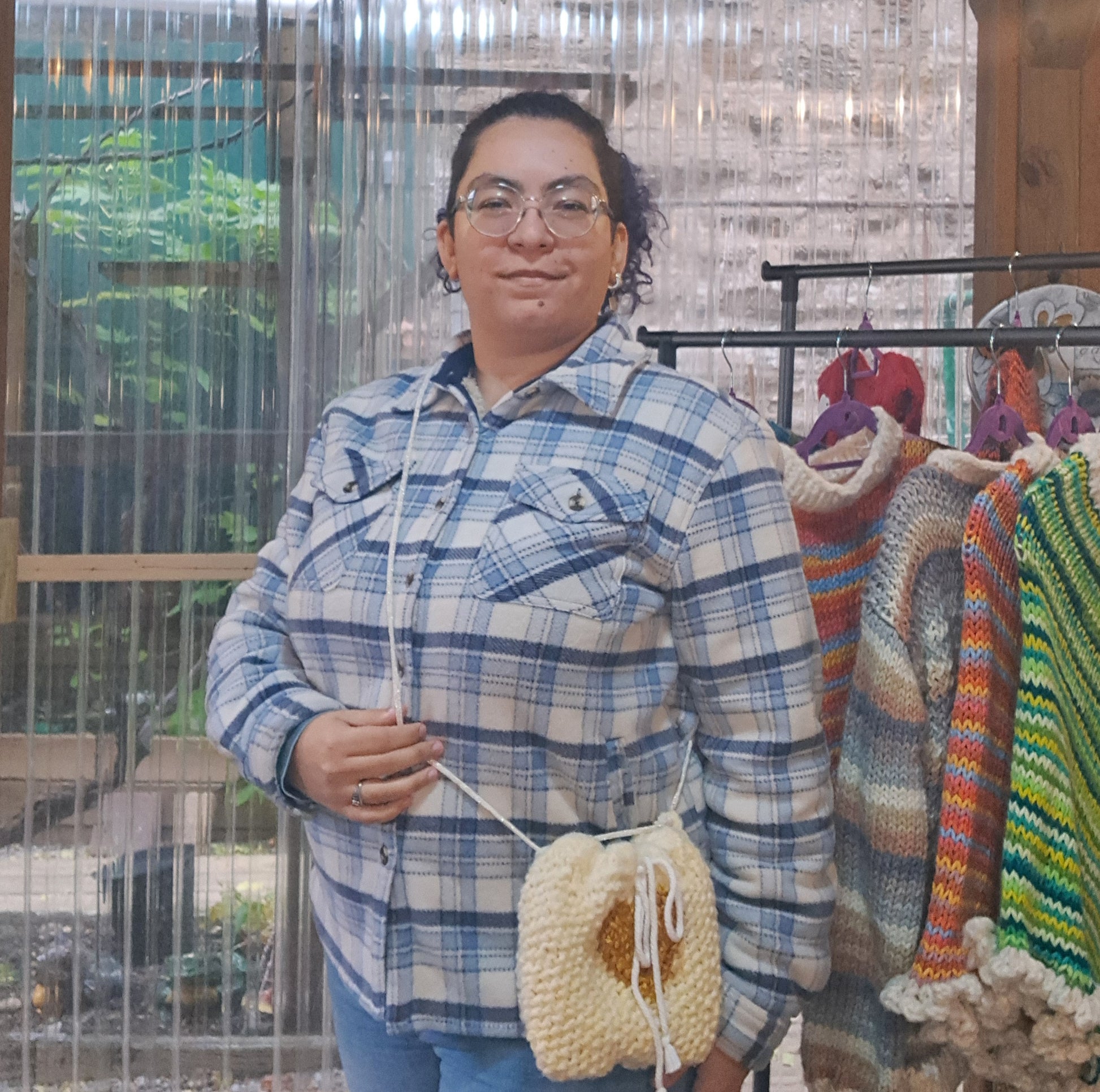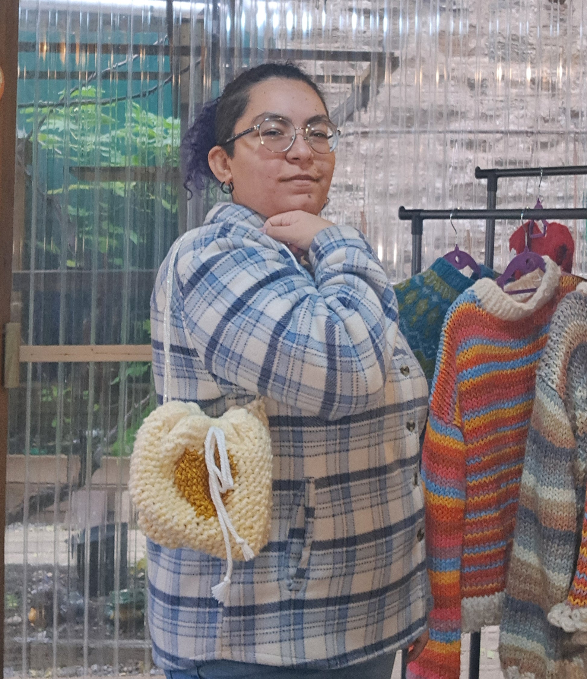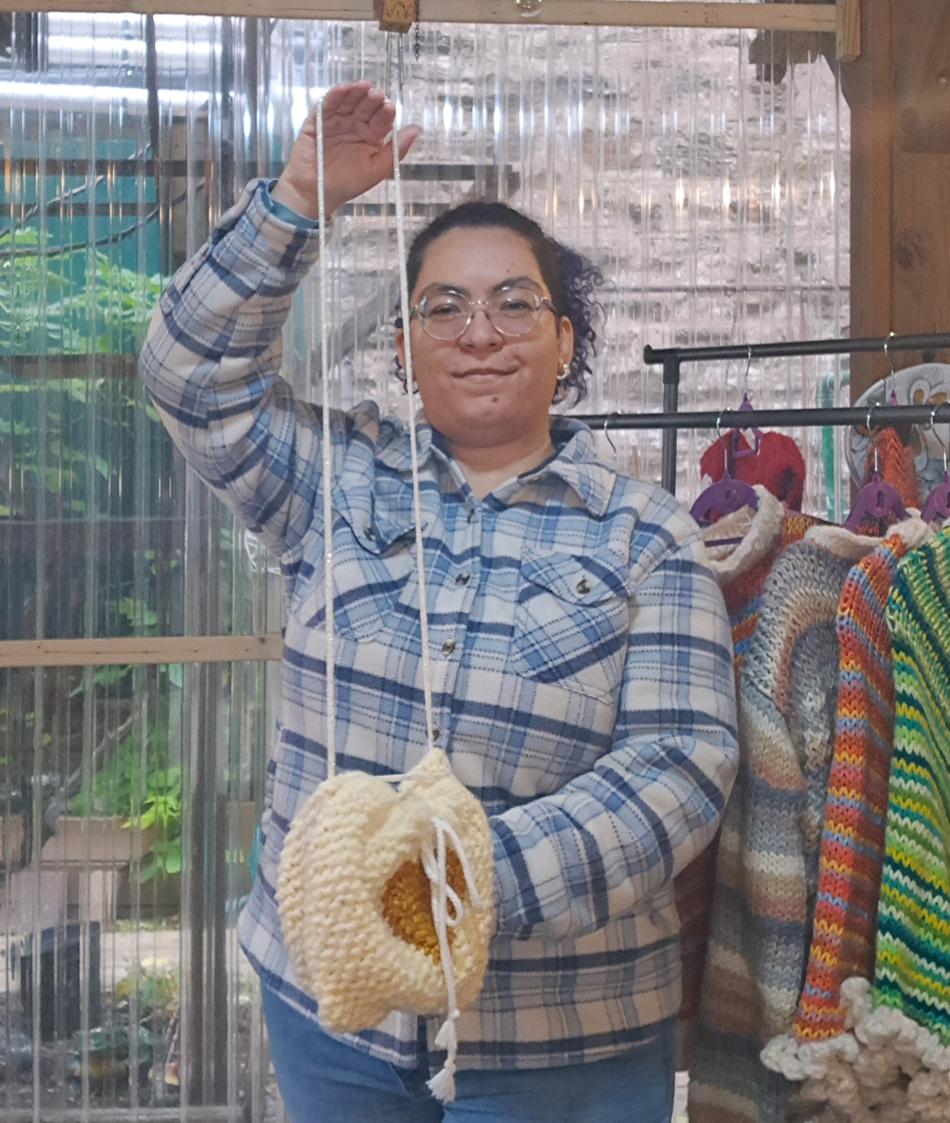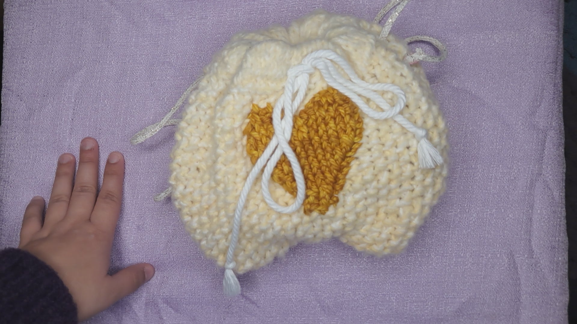 Made with Polyester yarn that is soft as can be and a satin patterned lining. The Golden heart is made with Hand dyed Merino wool. The Drawstring is a Cotton cord and the straps are a Cotton cord with Metallic Polyester.