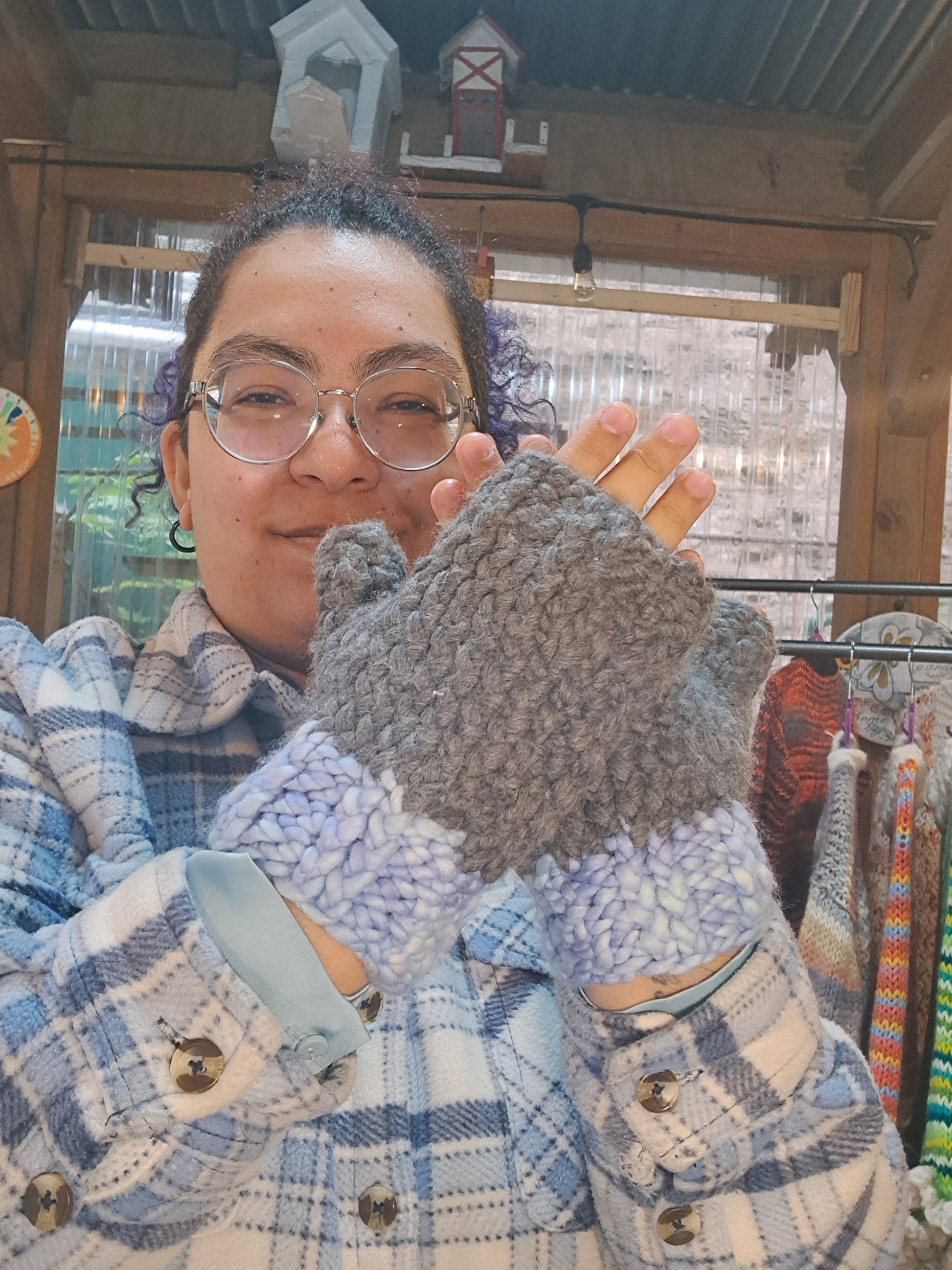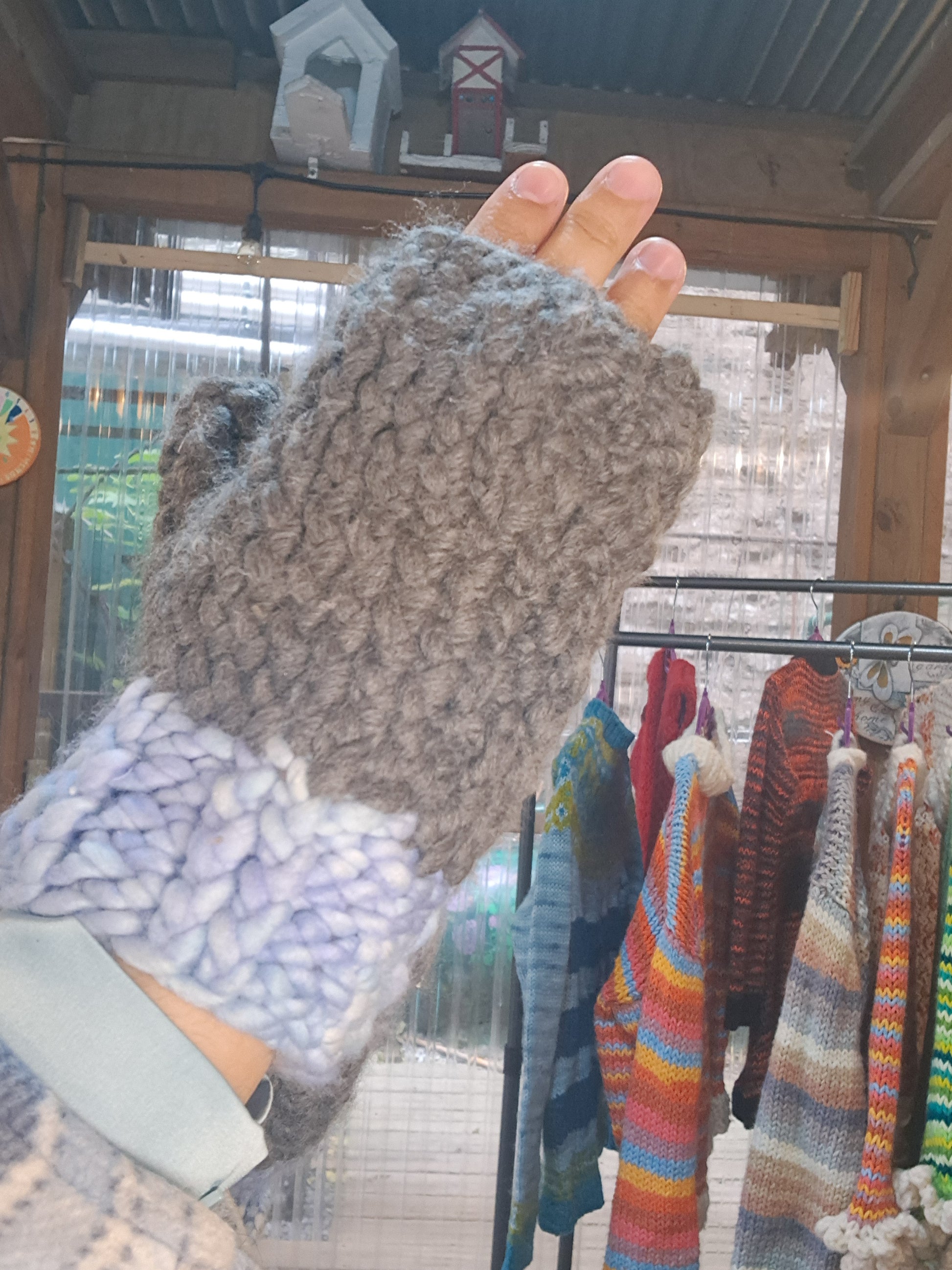 The yarn used is super wash Merino wool. Making it soft as can be and thick. The rim around the wrist allows you to tuck your sweater under it, adding an extra layer.