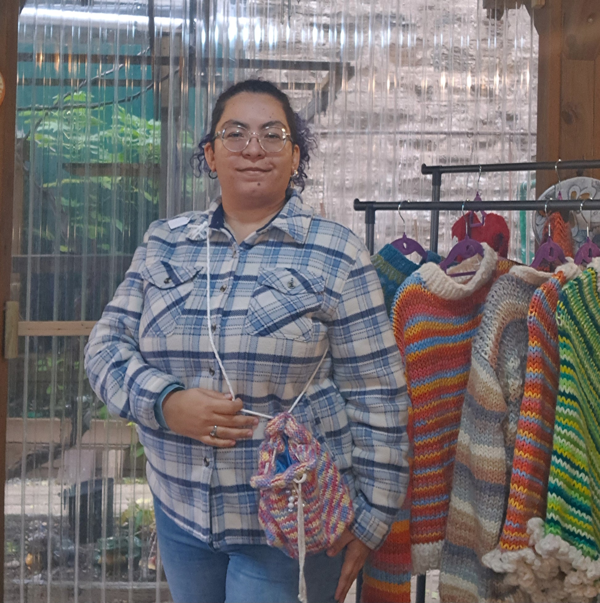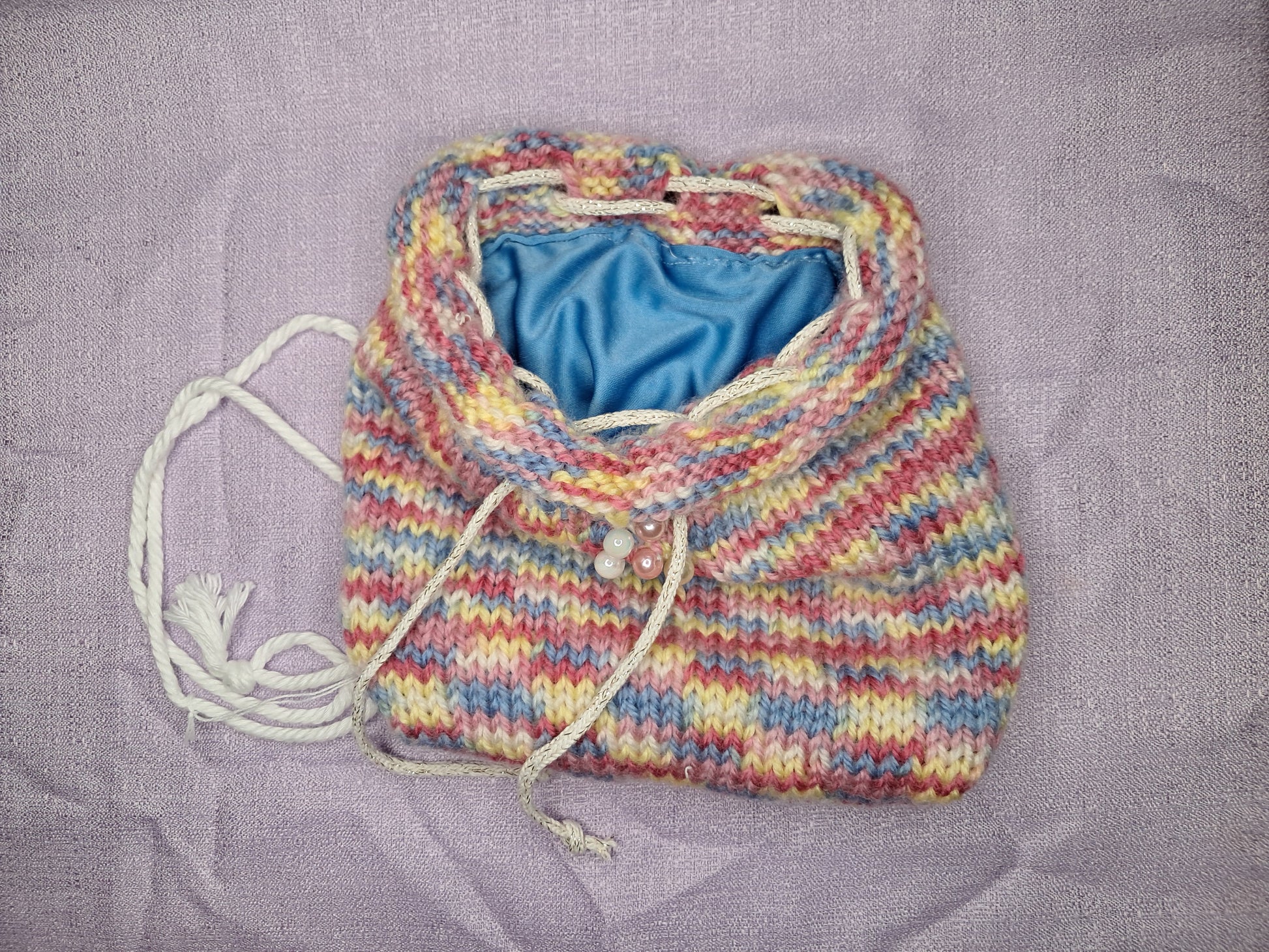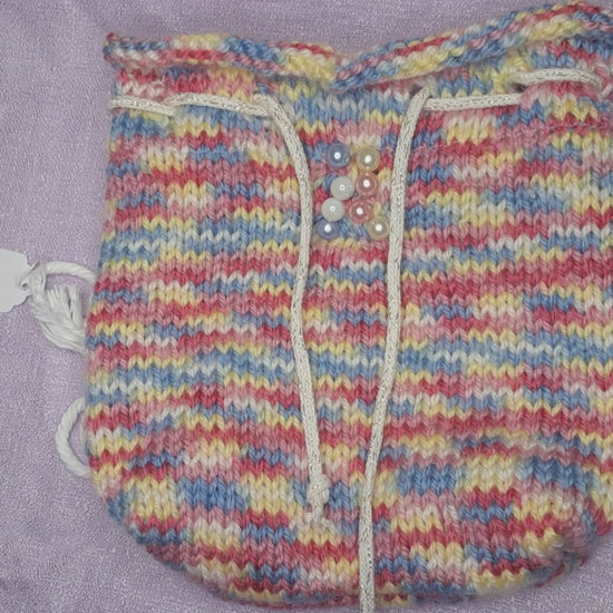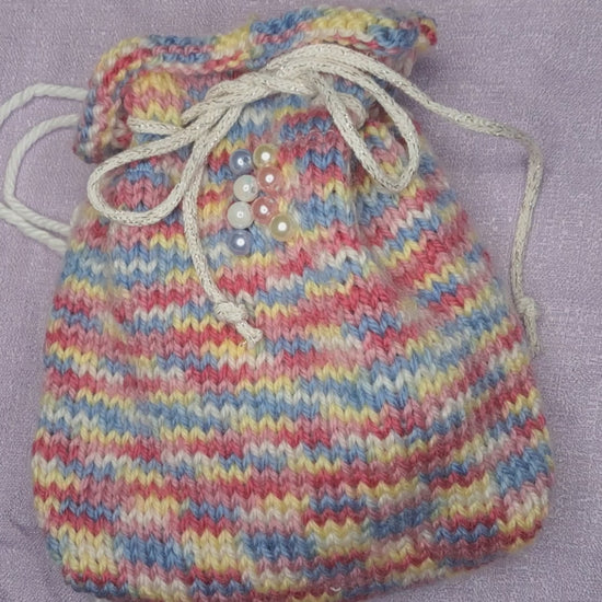 Made with Alpaca/Wool blend yarn that is soft as can be with the lining being a blue satin fabric. It also has 8 small beads in matching colors hand sewn onto the front for added charm. The Drawstring is a Cotton cord with Metallic Polyester. The strap is a Cotton cord.