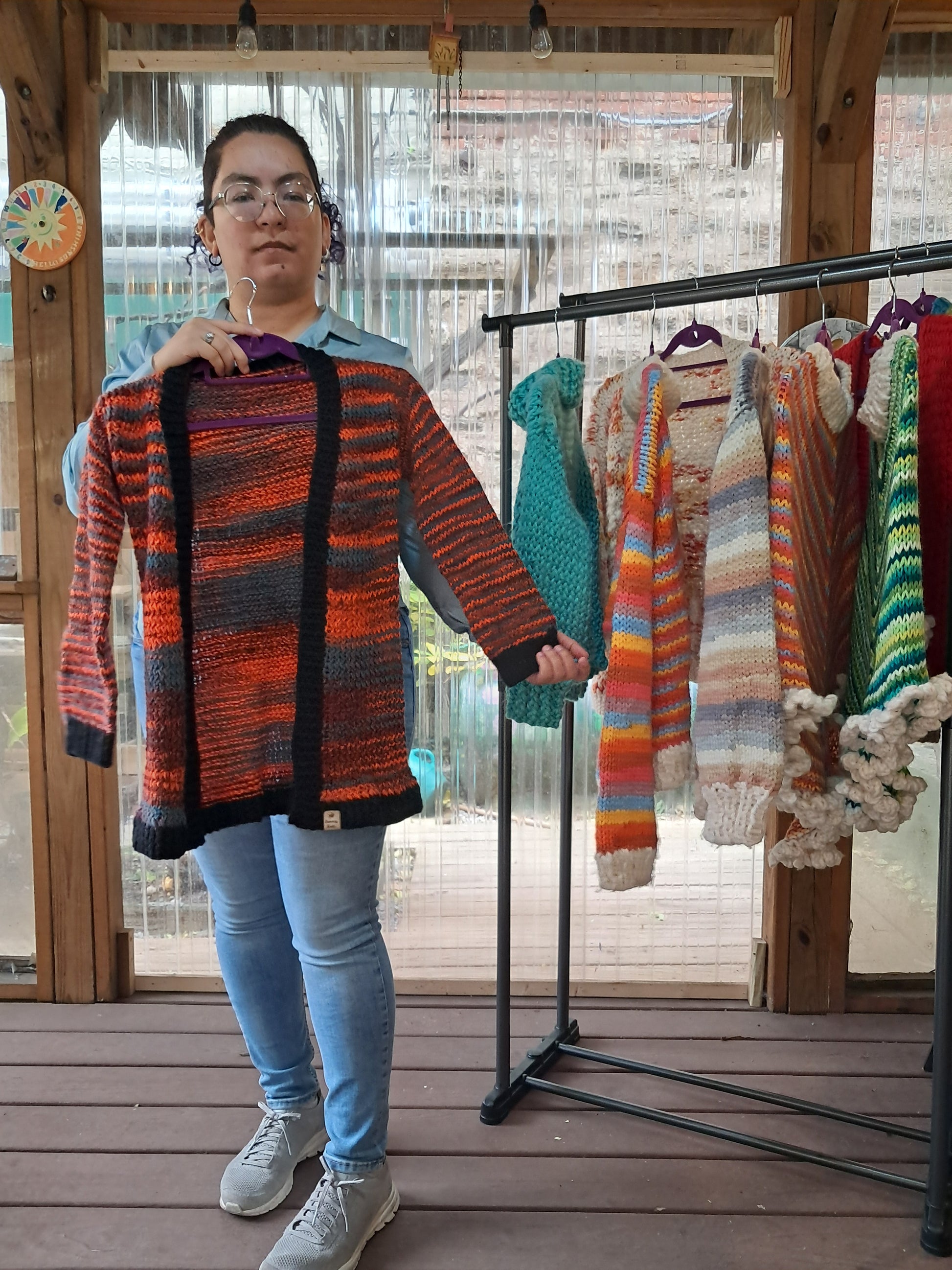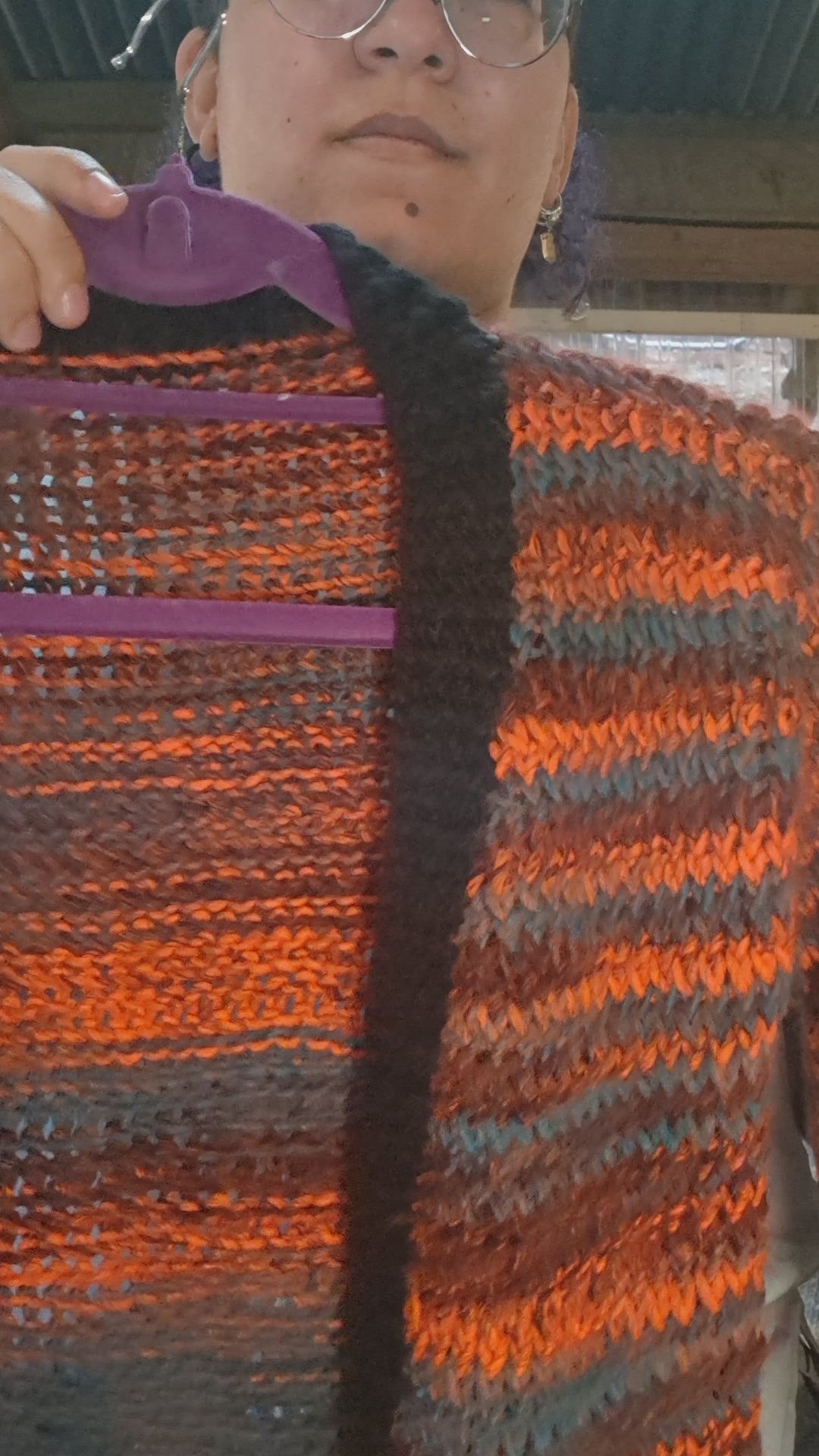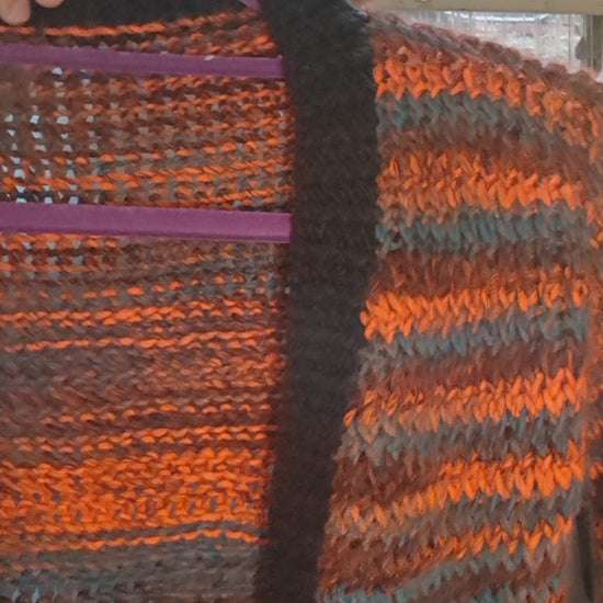 This dark colored Cardigan is made with wool with the edges in a Merino Wool/ Alpaca blend.