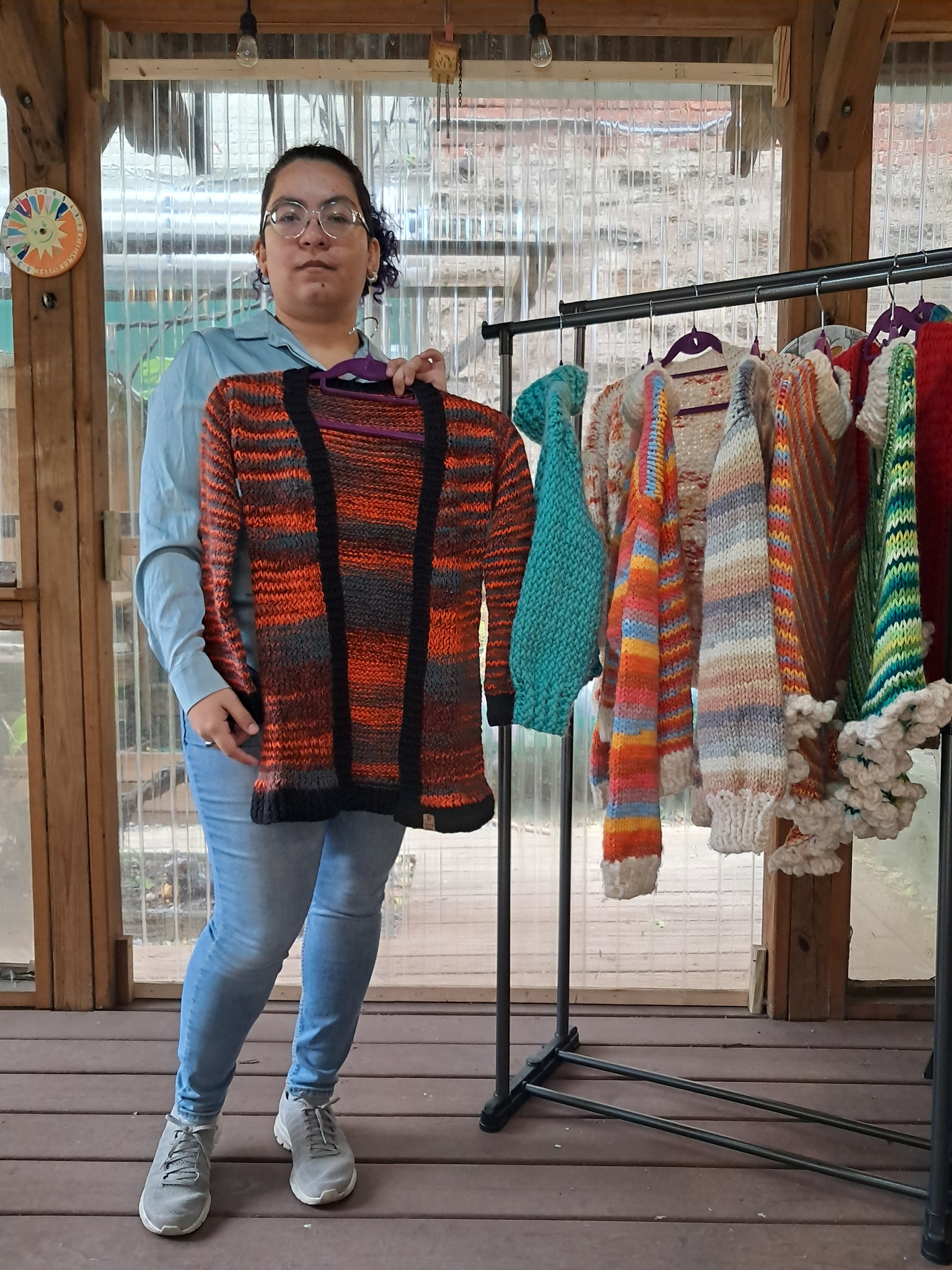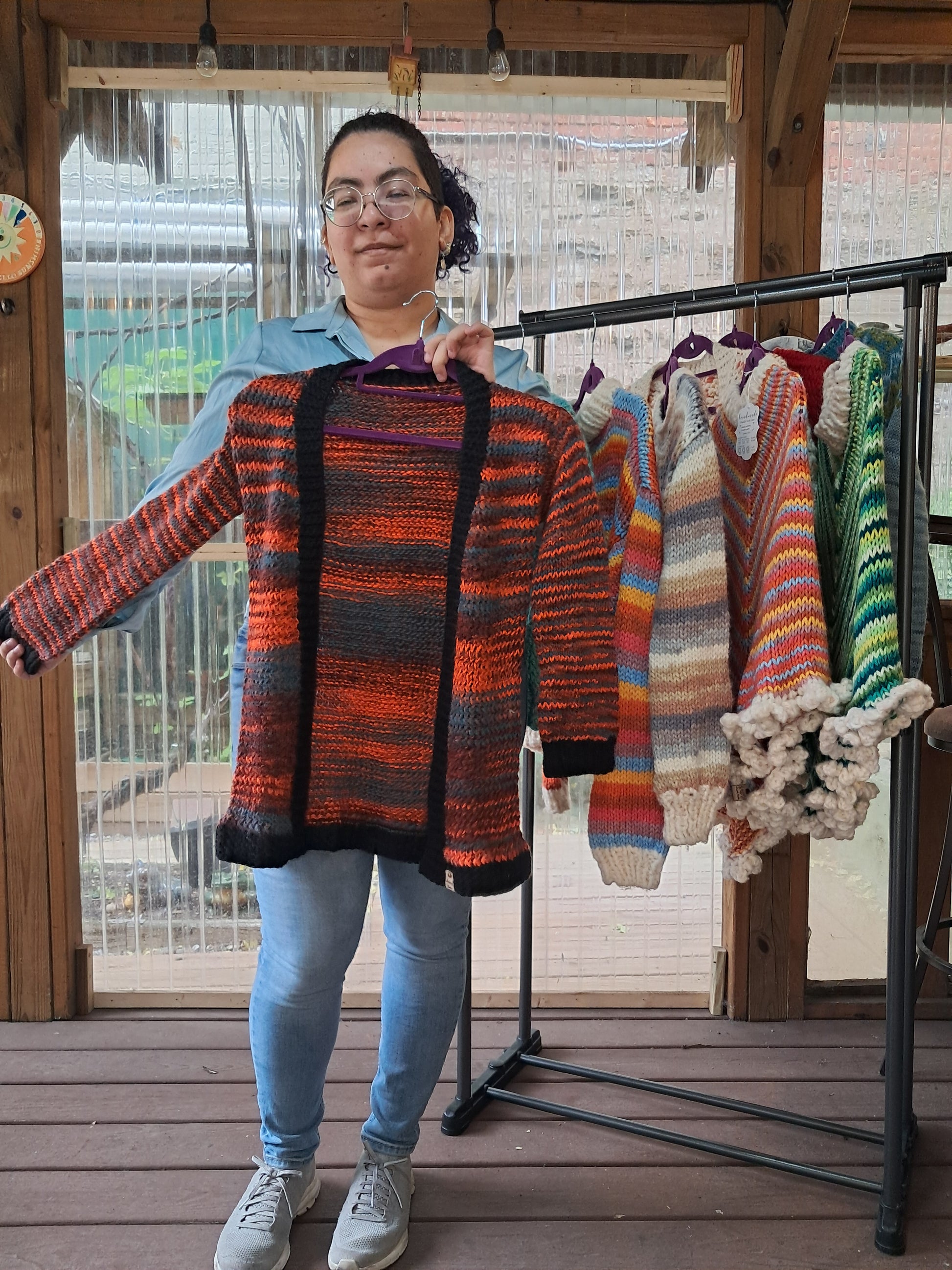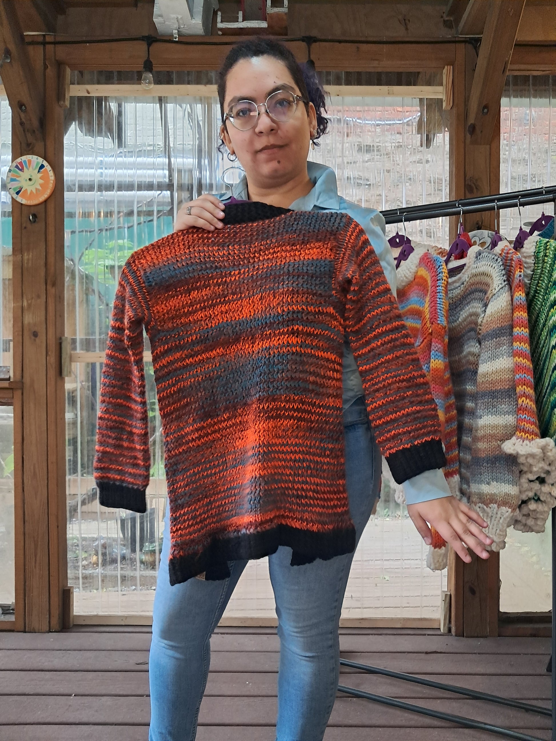 This dark colored Cardigan is made with wool with the edges in a Merino Wool/ Alpaca blend.