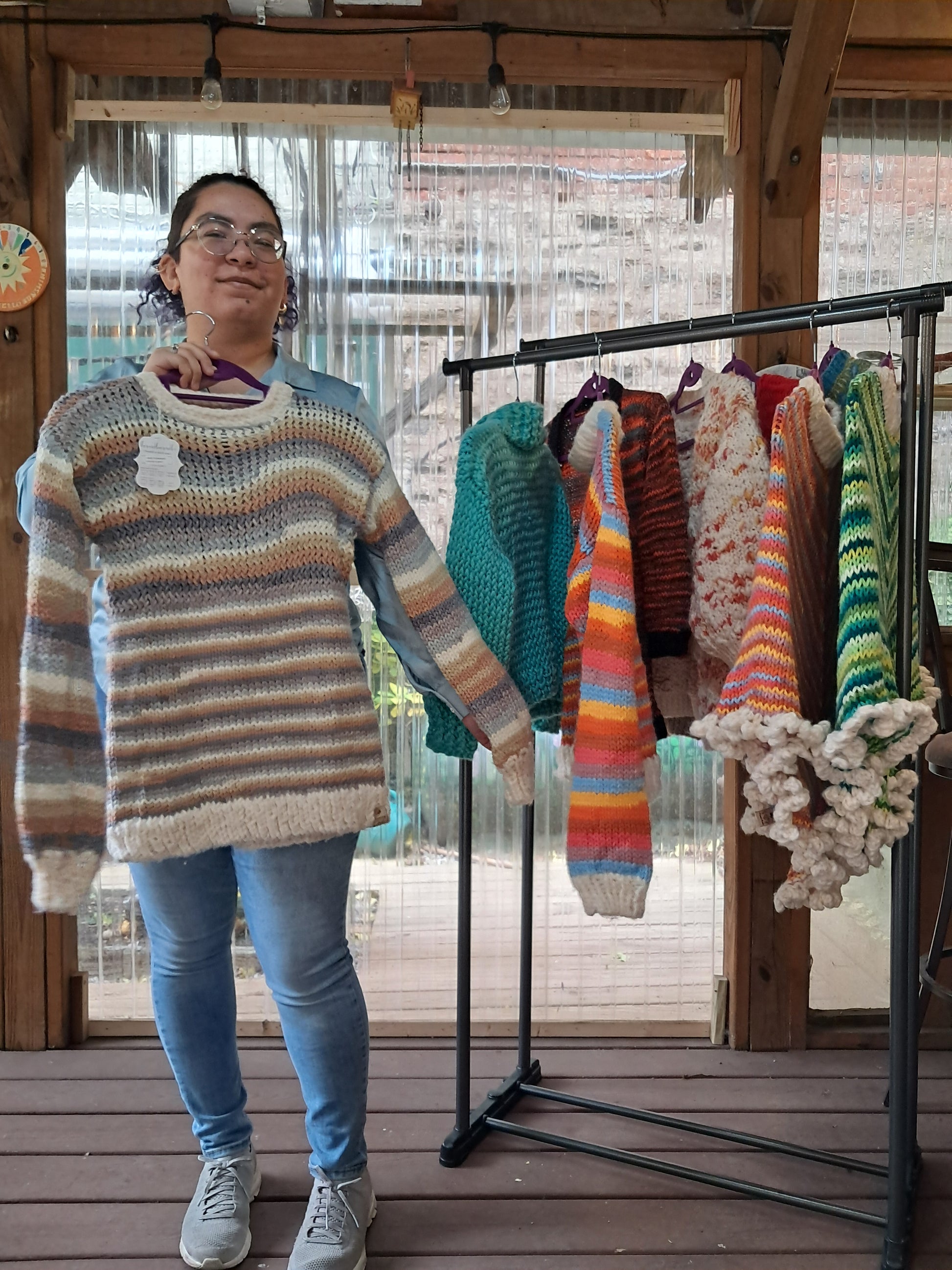 This soft and cozy Sweater is great for winter cold weather. The body is done with a bulky Acrylic yarn that's soft to the touch. With the edges are done with a fluffy blended yarn that make is feel like you're wearing a cloud.