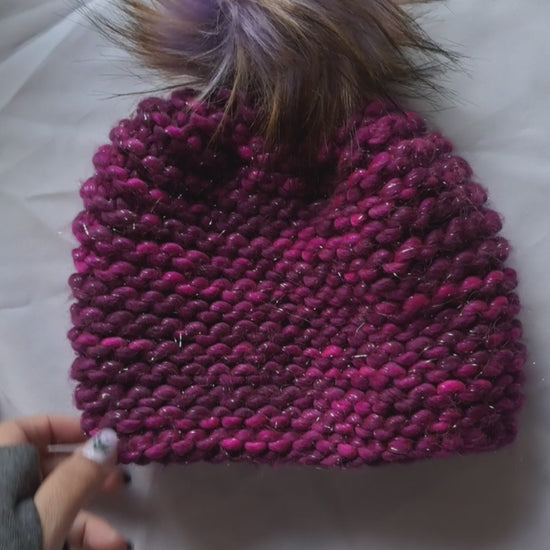 This hat is knitted with a thick hand dyed merino wool yarn with a hand sewn pompom on top.